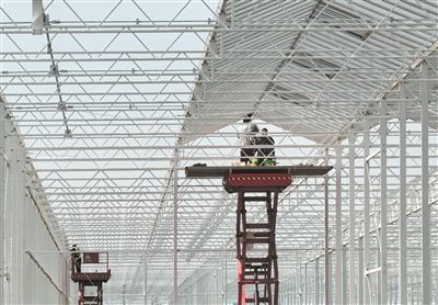 工人安装大棚玻璃。