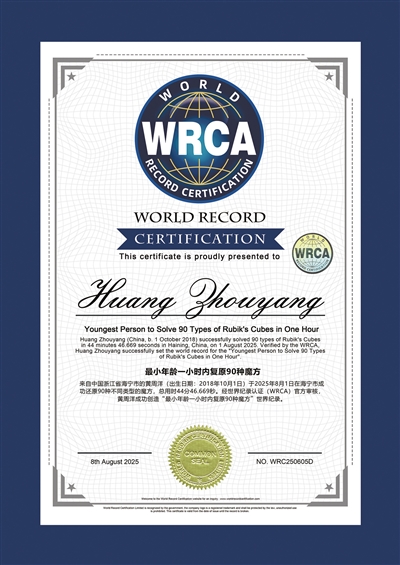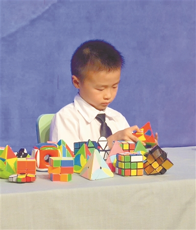 日前,年仅6周岁的海宁男孩黄周洋用44分46秒成功复原90种不同类型的魔方,经世界纪录认证(WRCA)官方审核,成功创造“最小年龄一小时内复原90种魔方”世界纪录。