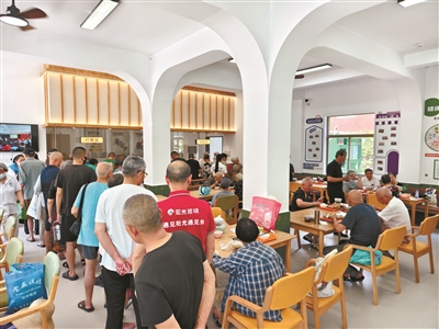 这家全新的食堂突破了空间局限,在社区居民会客厅原有服务体系基础上,实施系统性改造与时段精细化分割,构建出功能复合的便民新场景。通过阵地功能深度整合,办事服务区与食堂就餐区实现无缝连通,为老年群体打造出集便利、安全、优质于一体的暖心服务闭环。