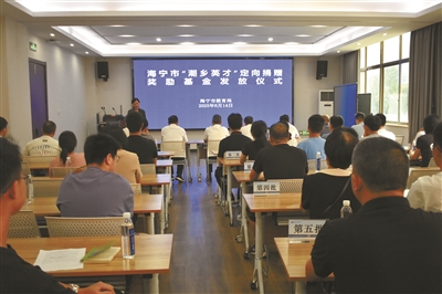 本报讯 8月14日,2025年海宁市“潮乡英才”定向捐赠奖励基金发放仪式在海高举行,获奖师生、家长代表等参加了本次仪式。