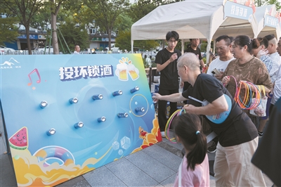 街区一角,酒瓶堆叠、骰子叠叠乐、投环锁酒三大挑战区排起长龙,通关即可领取啤酒。戏台大屏同步直播“浙BA”赛事,球迷们举杯畅饮,为精彩进球欢呼雀跃。市民姚先生和家人坐在台下,张家砂锅的小龙虾堆成小山,“吹着晚风、吃着虾、看着球,这里的氛围太好了。”