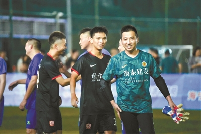 41岁的何霄飞,被队友和对手戏称为“海宁第一门将”。“大家调侃着说的,主要是踢得久,代表海宁出去过几次。”如今代表经开海昌出战“潮超”联赛,何霄飞心中多了一份为家乡而战的情怀,尽管各镇街球员私下多是朋友甚至曾是队友,但上了场,大家都拼尽全力。他享受这种社区足球带来的归属感和凝聚力。