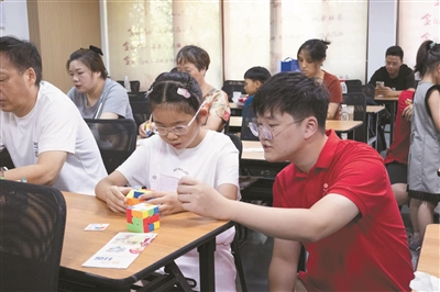 在南关厢社区的魔方课堂上,年过六旬的刘畅正手握魔方略显生疏地转动,身旁刚上小学的孙女则耐心讲解每一步还原技巧。“以前觉得这是小孩子玩的,现在一起学才发现乐趣无穷!”刘畅笑着说。自参加浙江开放大学海宁学院(海宁市社区学院)推出的祖孙共学课程以来,小孙女从基础还原到十字定位,一步步带领奶奶走进魔方的世界。