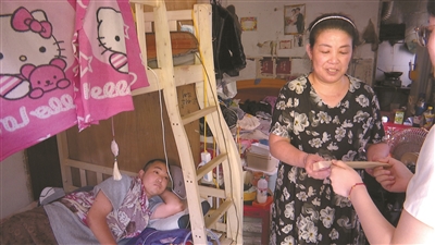 灿灿一家目前租住在一间农房里。狭小的房间内,摆放着父母的双人床,以及他和妹妹用的高低铺。灿灿正躺在床上休息,床边堆满了他日常需要服用的各种药物。