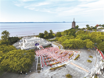 本报讯 8月26日上午,在盐官观潮胜地公园白石台广场,《歌唱祖国》的歌声响彻天空,300多名鼓手迎着潮水齐手击打非洲鼓。