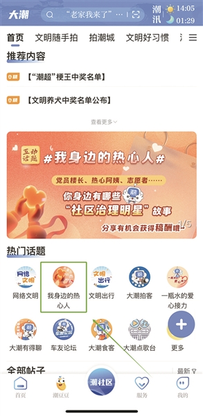 参与方式:打开大潮APP,点击首页下方“潮社区”版块,找到热门话题#我身边的热心人#,点击该图标即可进入发帖页面。