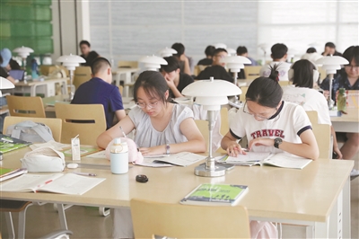 室外38℃高温炙烤,室内26℃书香清凉。连日来,高温持续,市图书馆成为不少市民的纳凉首选。每日午后,图书馆内1500个座位座无虚席,空调的凉风与书页的沙沙声,为潮城海宁编织着独特的风景线。 ■记者 张宇竞