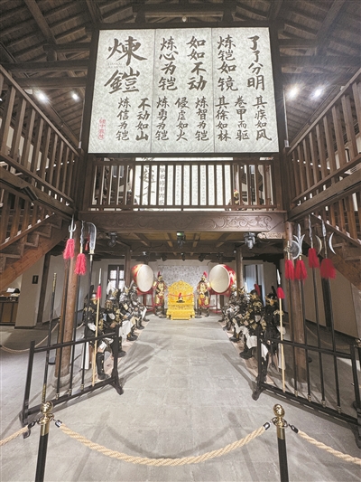 走近炼铠堂,只见门外耸立着两匹宋风格的具装马铠,高大而威武。移步堂内,里面是明风格的军帐景象,最前方贴了一幅明地图,边上摆着两面大鼓,模拟了古代战前的作战会议,增强了游客的体验感。