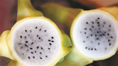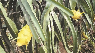 本报讯 近日,走进位于黄湾镇的海宁尖山果农园果棚,一条条形似仙人掌的藤条顺着支架向下舒展。藤条间缀着几颗金黄色的果实——外皮光滑无刺,模样与常见火龙果相近。扒开果皮,内里果肉晶莹如燕窝,咬下一口,软糯香甜中还带着淡淡的荔枝味。这便是果农园里的稀罕物——黄龙果。
