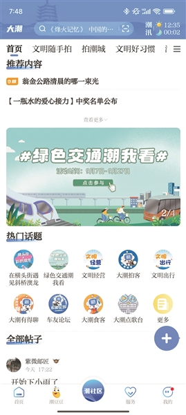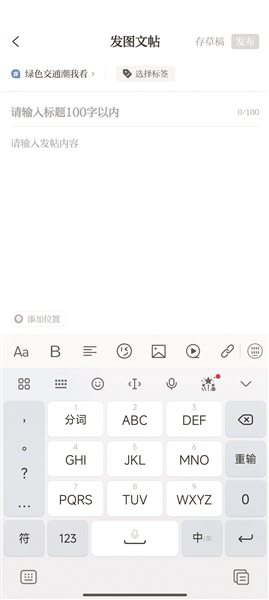 打开大潮APP,点击首页下方“潮社区”,找到热门话题#绿色交通潮我看#。点击该图标即可进入发帖页面后,点击右下角的“+”图标选择发图文帖/视频帖,填写上标题并输入发帖内容,配上需要附加的图片/视频,最后点击右上角的“发布”按钮,发帖就成功啦。
