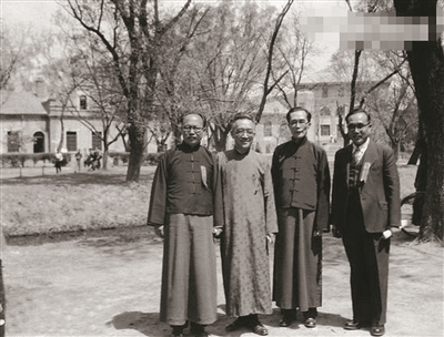 1947年,查良钊(左一)与胡适、梅贻琪、黄钰生摄于北京清华园。