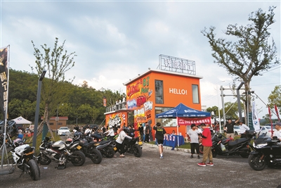 众多机车粉丝打卡钱塘骑士公路商店。