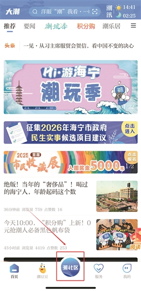 在大潮APP的Hi·游海宁——“潮”玩季页面或点击“潮社区”后选择“大潮帮你问”版块,即可开始提问。
