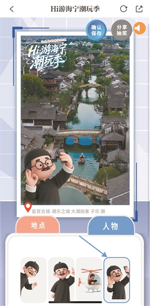 最后一站,可跟随王国维打卡海宁各旅游景点:盐官古城-潮乐之城、南关厢历史文化街区、干河街历史文化街区、康桥·1924文创岛……选择最喜欢的地点,和王国维Q版形象生成专属明信片。分享至微信朋友圈后,即可参与抽奖,赢取现金红包或大潮积分!