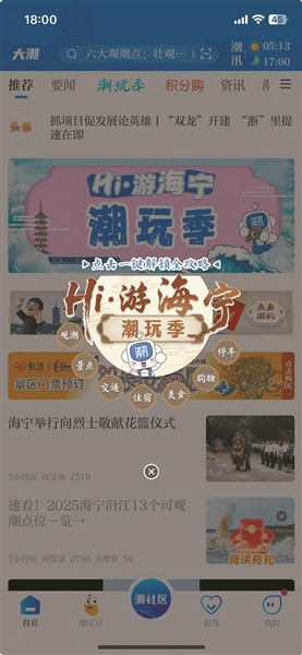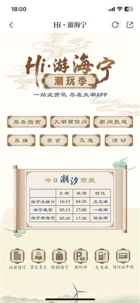 中秋、国庆+观潮季,大潮APP特别推出“Hi·游海宁-‘潮’玩季”聚合页,汇聚众多实用干货。不仅有一站式资讯,还有各种服务功能。