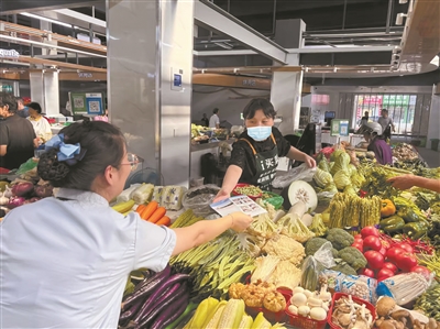 不久前,市区南苑菜场完成改造升级,此次改造聚焦农贸市场智慧化、便民化、本土化提升。改造后的市场焕然一新,中央空调保障了室内舒适的温度,亮堂又干净的环境吸引了大批市民前往。趁着南苑菜场新开业、市民逛市场的人流高峰期,邮储银行海宁市支行营业部主动走进菜场开展宣传。