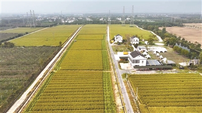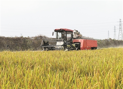 近日,在马桥街道利众村水稻制种田里,收割机正开足马力对成熟的水稻进行收割。收割好的田块里将轮作播种油菜,助力农户增收。
