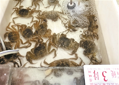 而在另一个水产摊位上,大闸蟹来自南京固城湖。这两个摊位的大闸蟹,都是中国地理标志产品。“我们的货源都是精品蟹。卖精品的话一斤起码要贵10元钱,但我们还是愿意拿精品,价格虽然贵一点,但是卖出去了有保障,客户下次还会来买。”摊主程海英说。