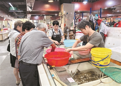 本报讯 近日,在市中心菜场水产区,一个个水产摊位上品类丰富。这几天,除了个大肉嫩的罗氏沼虾持续热销外,商家也给市民推出了时令水产——大闸蟹。