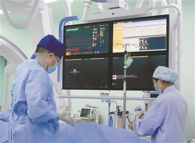 9时15分,在120急救车的护送下,患者被紧急转诊去海宁市人民医院。在患者转院途中,海宁市人民医院胸痛中心的医护人员早已做好充分的准备。患者到达医院后,医护人员迅速将其送入导管室,一场与时间赛跑的血管开通手术立即展开。手术过程中,医护人员发现患者造影右冠中断次全闭塞,后三叉前重度狭窄,情况十分危急。