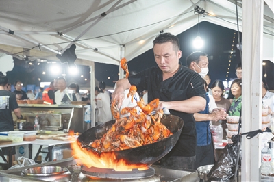 随着暮色渐浓,200多个特色摊位组成的各大区域同步沸腾。熟醉澳龙、蒜蓉蒸虾、十三香龙虾香气四溢,斜桥榨菜、三联肉皮、杨家酱等农特产品也颇受欢迎。