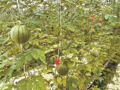 不同于传统地栽模式,“福娃娃”采用立体栽培与无土栽培相结合的方式。“藤蔓吊起来后,果实不接触地面,既能充分接受光照,让果皮转色均匀,避免出现青红不均的情况,还能大幅减少细菌感染和病害。”魏子皓说,无土栽培模式还能节省肥料、水资源和其他能源,实现绿色高效种植。同时,大棚通过遮阳网、通风口等设施精准调控温湿度,为西瓜生长提供适宜环境。