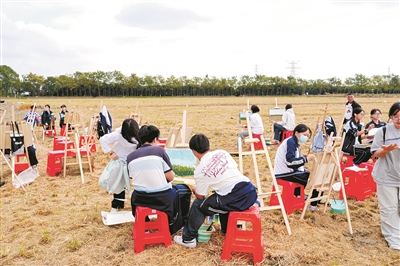 不远处的“稻草人乐园”里,非遗柴草编织技艺的传承人正现场演示稻草人制作,吸引了不少大朋友、小朋友围观。来自海宁技师学院的学生们则在指定区域支起画架,以“稻田乡村画”写生的方式,将金秋田野的动态美景定格于画布之上,成为活动现场一道流动的艺术风景线。