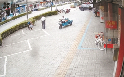 本报讯 近日,黄湾镇一位老人在人行道上不慎摔倒连连喊疼。紧急时刻,路边打印店的老板沈锋马上上前搀扶,并搬来椅子。