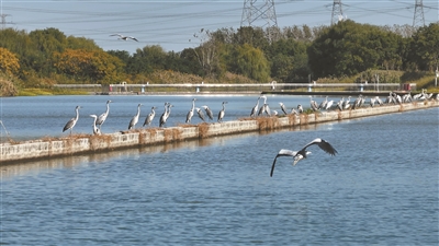 在长水塘水源生态湿地,一群苍鹭和白鹭整齐伫立在水中央的堤坝上,姿态娴静优雅。