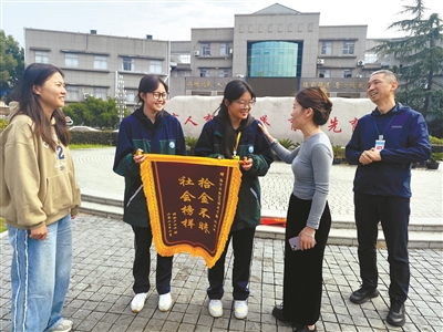 这份感动并未止步于电话。10月27日,失主卢女士专程前往海宁卫生学校,将一面书写着“拾金不昧 品德高尚”的锦旗送到了两位同学手中,当面向她们表达了诚挚的谢意。