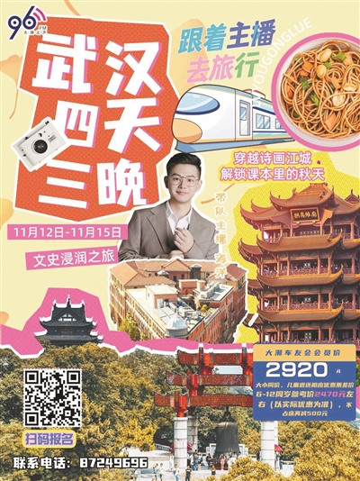 潮主播海洋带队,不用查攻略、不用做计划,带娃把语文课搬进黄鹤楼、把历史课装进湖北省博物馆,从东湖秋叶标本到《知音号》民国穿越,每一步都有知识彩蛋,每一刻都是亲子互动的温暖记忆。这不仅是旅行,更是给孩子的“行走课堂”,给家庭的“秋日限定回忆”。
