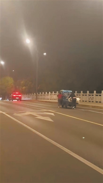 当晚8点37分,夜色笼罩,晚风带着些许凉意。张女士像往常一样沿着小区西区外的管泾港路夜跑。跑到桥边时,前方一个移动的身影让她放慢了脚步——一辆打着双闪的汽车停在路边,一名中年男子刚下车,就径直走向旁边一位推着一辆“三卡”的女士,伸手扶住车尾,默默帮着往前推。