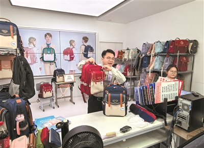 同一时间,在卡拉扬集团海宁总部生产基地,160名工人正铆足干劲赶订单,车间里到处是一片缝纫机的飞转声。这里有10条生产流水线,主要生产各类书包,采用小批量多品种快返模式,产品经过检验100%合格后入库。