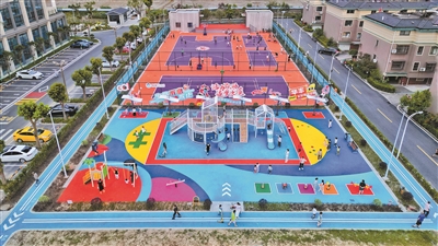 站在公园一角,放眼望去,3000多平方米的文化体育公园里,塑胶环形跑道绕着绿地铺开,标准篮球场、羽毛球场、气排球场一一排开,儿童乐园里滑梯、秋千一应俱全。