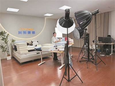 本报讯 近日,在位于盐官镇的川洋家私生活馆的记忆枕直播间里,主播拿起一款慢回弹安睡枕向观众展示:“这款枕头是很多高端酒店同款,躺下就像被云朵包裹……”镜头外,运营人员紧盯着后台不断跳动的订单数字,忙碌而有序。这样的场景,如今在川洋家居已是常态。