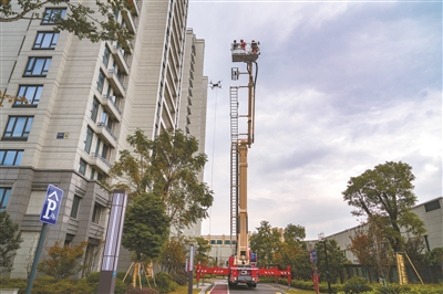 11月是全国消防宣传月。近日,袁花镇在望湖嘉苑小区组织开展高层住宅应急消防联合实战演练。图为45米登高平台消防车与专用消防无人机协同救援。 ■记者 杨立超 摄