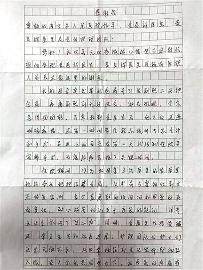 患者家属送来的感谢信。