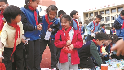 以“旧物换新趣”为主题,各个摊位上大多是同学们从家里带来的闲置物品,如毛绒玩具、书籍等。其中也不乏创新之举,有的同学将精心绘制的画作进行销售;还有的开动脑筋,自制“盲袋”,售价2个校园蜗牛币。盲袋里有的是购物抵价券,有的则是“再抽一次”的机会。“我想通过这样的方式,吸引顾客多在我们摊位上买东西,他们抽了优惠券之后,肯定会在我们摊位上消费的。”谈桥小学学生蒋予璐自豪地对记者说,“我准备了十多个盲袋,开售20分钟,只剩5个了。”