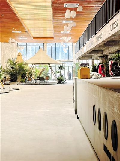 走进厂房内部,咖啡店就位于一层空间,周日起营业。周郭赟超介绍,未来一层还将有几百平方米的餐厅,定位是深受年轻人喜爱的“漂亮饭”风格,更将汇聚室内攀岩与滑板等业态。二层更为安静,计划设置为疗愈空间,并配备多间独立研学教室。