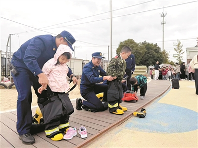 为增强直观认识,活动专门设置消防无人机出水表演及器材实操区。在消防服装体验区,学生们试穿灭火防护服、抢险救援服等专业装备,厚重的防护服使孩子们深切体会到消防员肩负的责任与艰辛。师生们还踊跃参与了室内消火栓操作、消防水带连接及射水体验。现场气氛热烈,学习氛围浓厚,有效筑牢了校园消防安全“防火墙”。