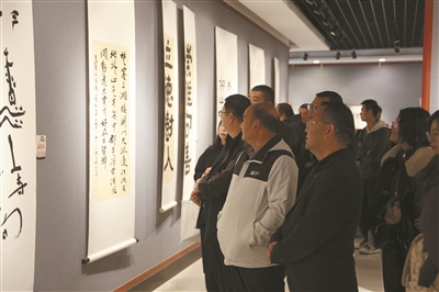 考察团参观海宁中学师生书画作品。