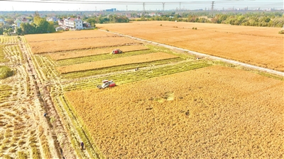 日前,记者来到博儒桥村种粮大户孙迎红的1500多亩杂交水稻田间,金黄的稻穗压弯了腰,在阳光下泛着饱满的光泽。三台大型收割机穿梭在金黄的稻浪中,轰鸣声响彻田间,沉甸甸的稻穗被快速收割、脱粒,奏响今年秋冬季节的“丰收交响曲”。