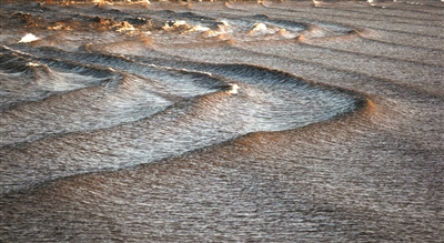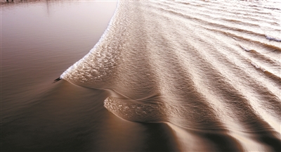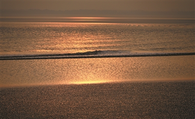 小潮汛的日子,潮水没有往常那样汹涌澎湃,而是带着一种慢悠悠的、懒洋洋的感觉涌来。潮头一改往日雷霆万钧的凶猛气势,显得格外温柔,就像一匹被晚霞浸透的、光滑柔软的素练,泛着细腻柔和的光泽,漾着细密柔光温柔地漫涌。