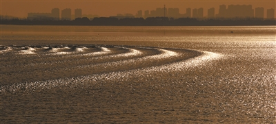 阳光正好照在翻卷的浪尖上。刹那间,满江的波涛都像是烧开了锅的金色沸水,又像是巨龙抖动着它那无数片金光闪闪的鳞甲,气势磅礴地向着栈桥方向压过来。