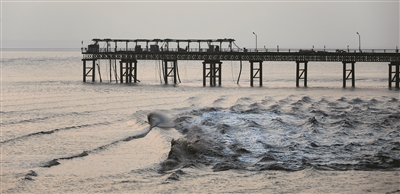 弯塘头海塘,是钱塘江“折返潮”起始点。但在海塘上拍摄“折返潮”,只能拍摄到向着海塘方向的“潮尾巴”。在江中栈桥上拍摄“折返潮”,才能真正拍摄到潮头的精髓。