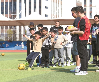 “4”是指大课间、社团活动、多彩时光和家庭体育作业。每天上午的大课间,全校学生会在跑操后分年段开展足球专项练习;下午的“多彩时光”,孩子们自由组织足球比赛;寒暑假的足球特色作业让运动从学校延伸到家庭。