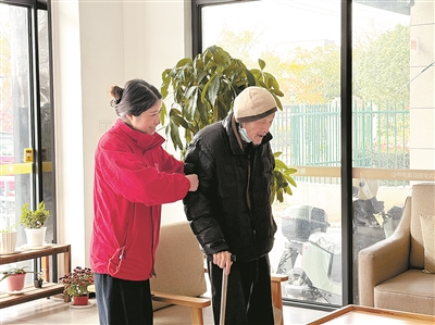 志愿者扶高铭山行走。