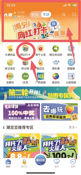 怎样才能拥有这份宝藏地图?打开大潮APP,在首页最上方导航栏点击“生活”选项,即刻跳转至“生活”界面,点击轮播图海报或者下方“网红打卡”按钮,即可进入页面。
