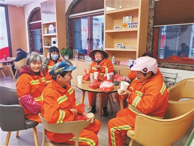 环卫工人王阿姨接过包子和姜茶,高兴地说:“我天没亮就出门扫地,现在能喝上热茶、吃上热包子,心里暖和!”