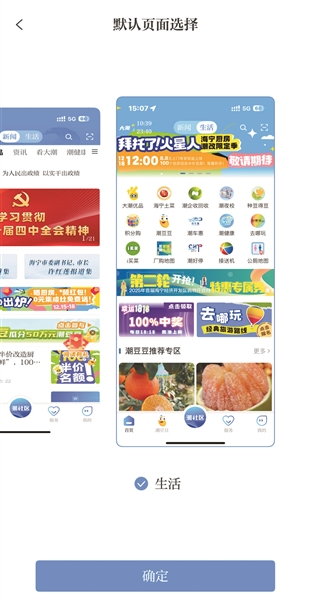 V14.1.14版本可自主选择默认首页。“我的→首页设置”功能让你实现自由选择。如果你关注新闻资讯,可以将新闻设为默认,第一时间掌握海宁动态;如果你是生活达人,偏爱浏览本地特色产品,那么生活页面就是你的不二之选。